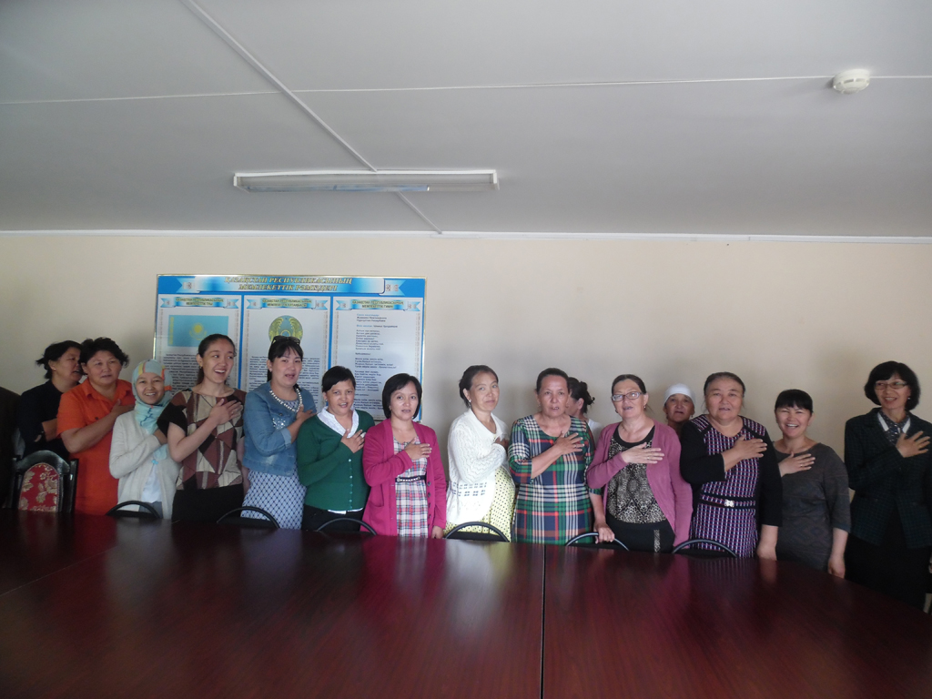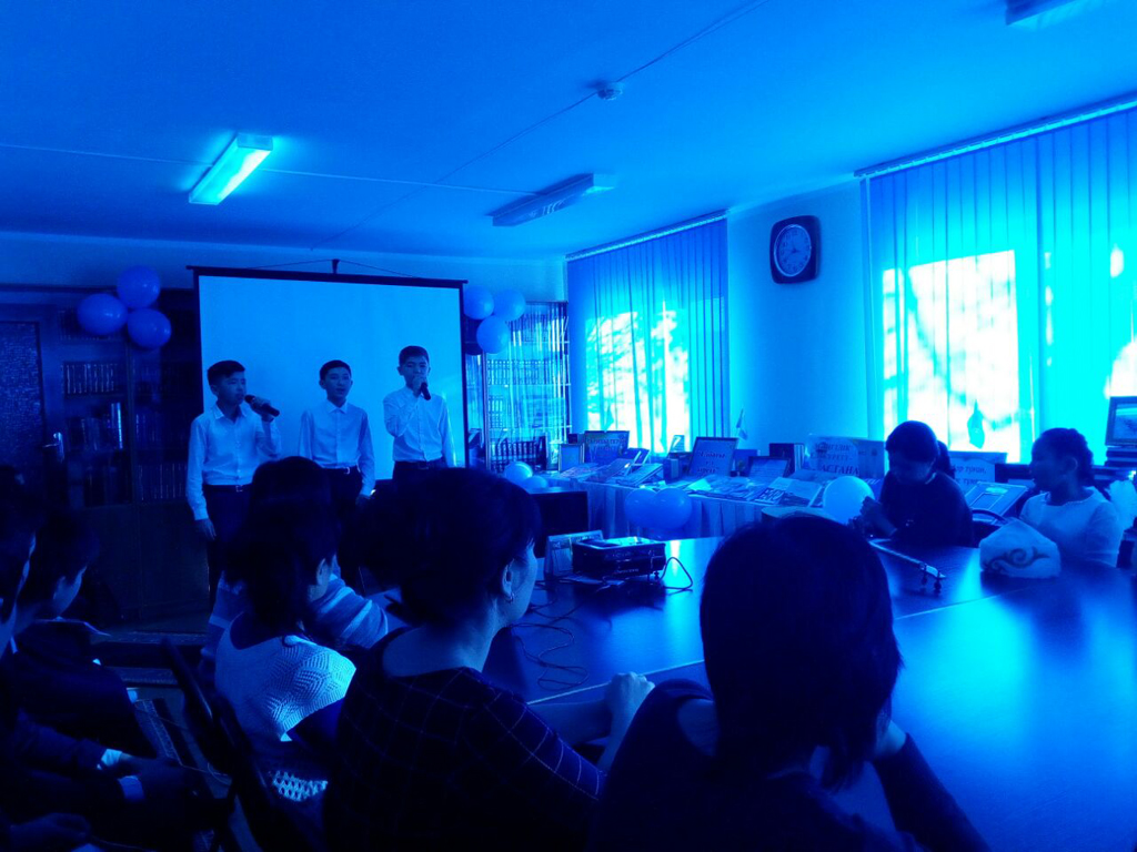 Кітапхана қызметкерлері «Менің Қазақстаным» ҚР Гимнін шырқауда. 2016. |