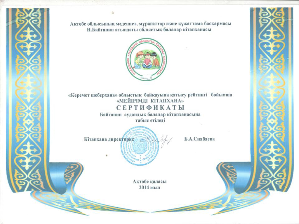 | 2015 жылы Н.Байғанин атындағы Ақтөбе облыстық балалар кітапханасында. Ақын Н.Байғаниннің туғанына 155 жыл толуына орай ұйымдастырылған "Ең үздік буктрейлер" облыстық кәсіби байқауында озып шыққаны үшін Байғанин аудандық балалар кітапханасы Дипломына ие болды. |