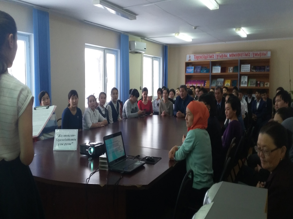 Жарқамыс модельді ауыл кітапханасында «Тәуелсіздік-25: Туың мәңгі желбіресін, Қазақ елі!» тақырыбында әдеби-патриоттық кеш. 2016. |