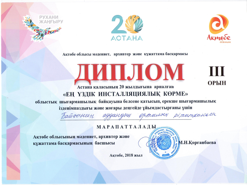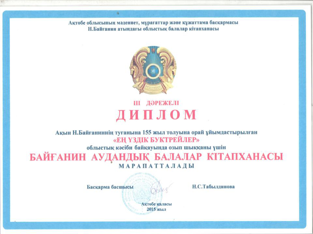 | 2015 жылы Н.Байғанин атындағы Ақтөбе облыстық балалар кітапханасында. Ақын Н.Байғаниннің туғанына 155 жыл толуына орай ұйымдастырылған "Ең үздік буктрейлер" облыстық кәсіби байқауында озып шыққаны үшін Байғанин аудандық балалар кітапханасы Дипломына ие болды. |