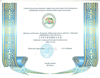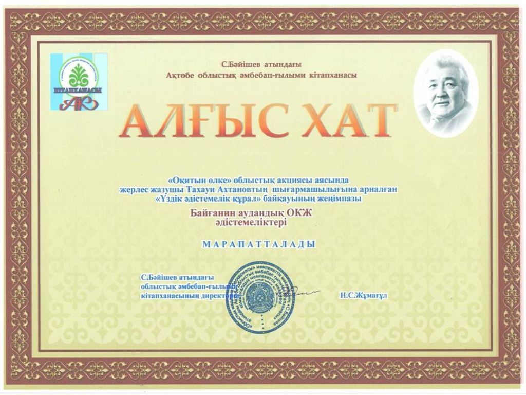 | "Оқитын өлке" облыстық акциясы аясында жерлес жазушы Тахауи Ахтановтың шығармашылығына арналған "Үздік әдістемелік құрал" байқауының жеңімпазы Байғанин аудандық ОКЖ әдістемеліктері Алғыс хатына ие болды. |