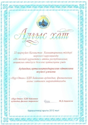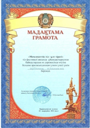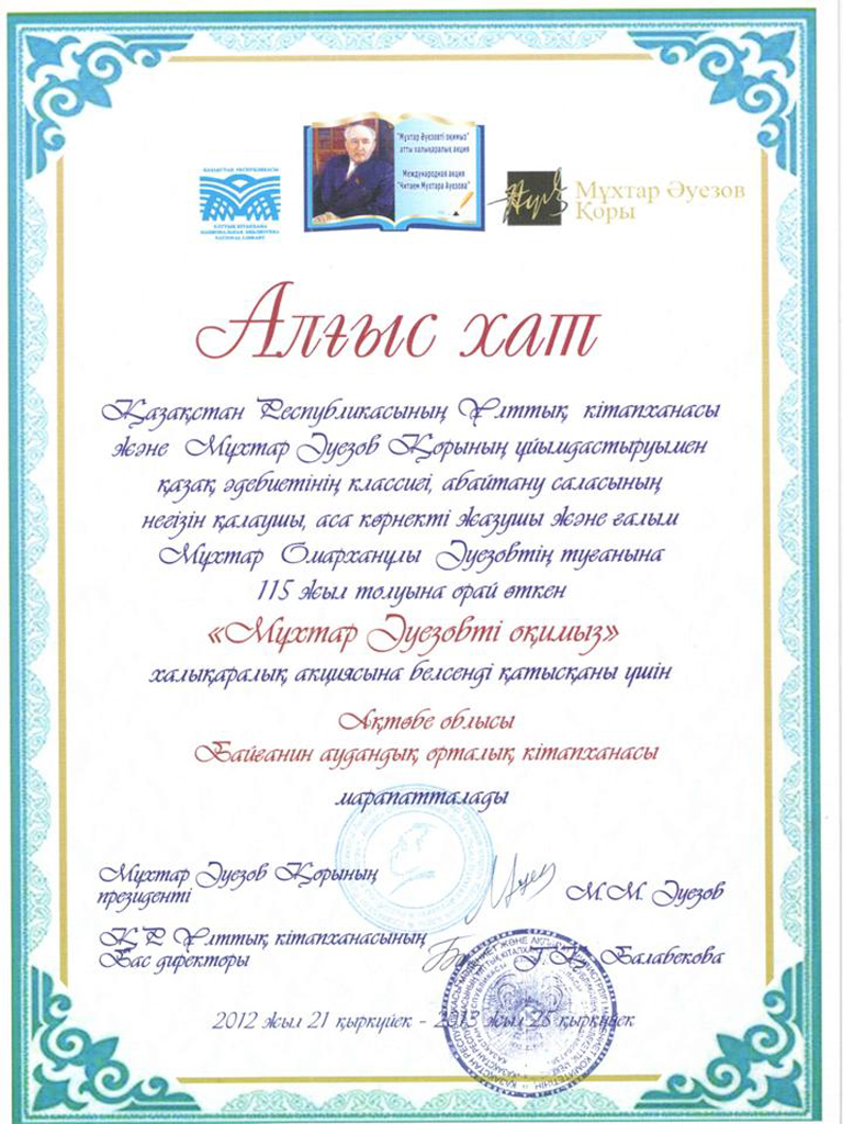 | 2013 жылы М.О.Әуезовтың туғанына 115 жыл толуына орай өткен «Мұхтар Әуезовты оқимыз» халықаралық акциясына қатысқаны үшін ҚР Ұлттық кітапханасы мен Мұхтар Әуезов қорының Алғыс хатына ие болды. |
