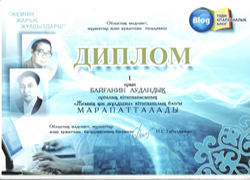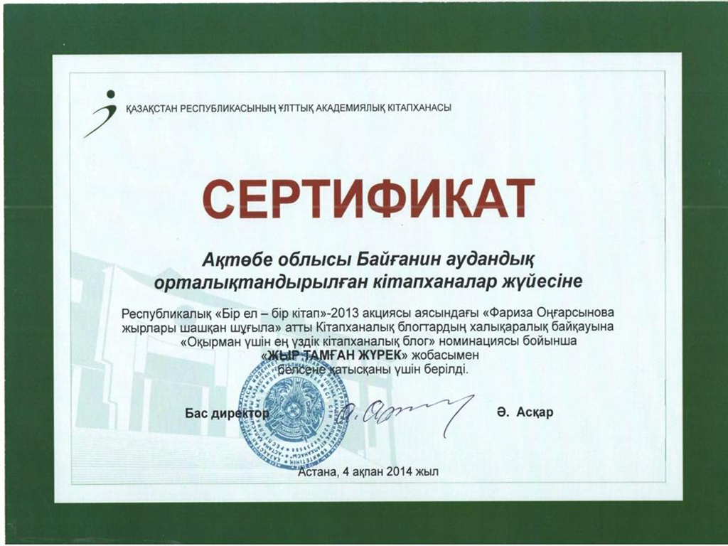| 2013 жылы Республикалық «Бір ел- бір кітап»-2013 акциясы аясында «Фариза Оңғарсынова жырлары шашқан шұғыла» атты Кітапханалық блогтардың халықаралық байқауына «Оқырман үшін ең үздік кітапханалық блог» номинациясы бойынша baiganin.blog.spotcom. «Жыр тамған жүрек» жобасымен қатысып ҚР Ұлттық Академиялық кітапханасының Сертификатын иеленді. |