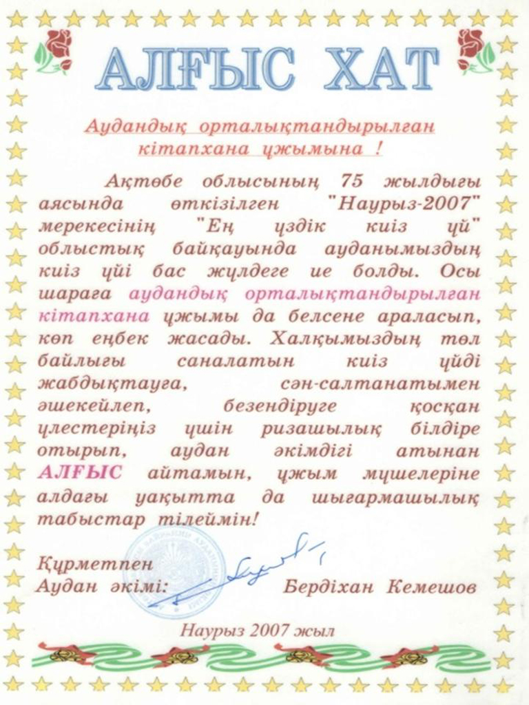 | Аудандық орталықтандырылған кітапхана ұжымы Ақтөбе 75 жылдығы аясында өткізілген "Наурыз-2007" мерекесінің "Ең үздік киіз үй" облыстық байқауында ауданымыздың киіз үйі бас жүлдеге ие болды. |