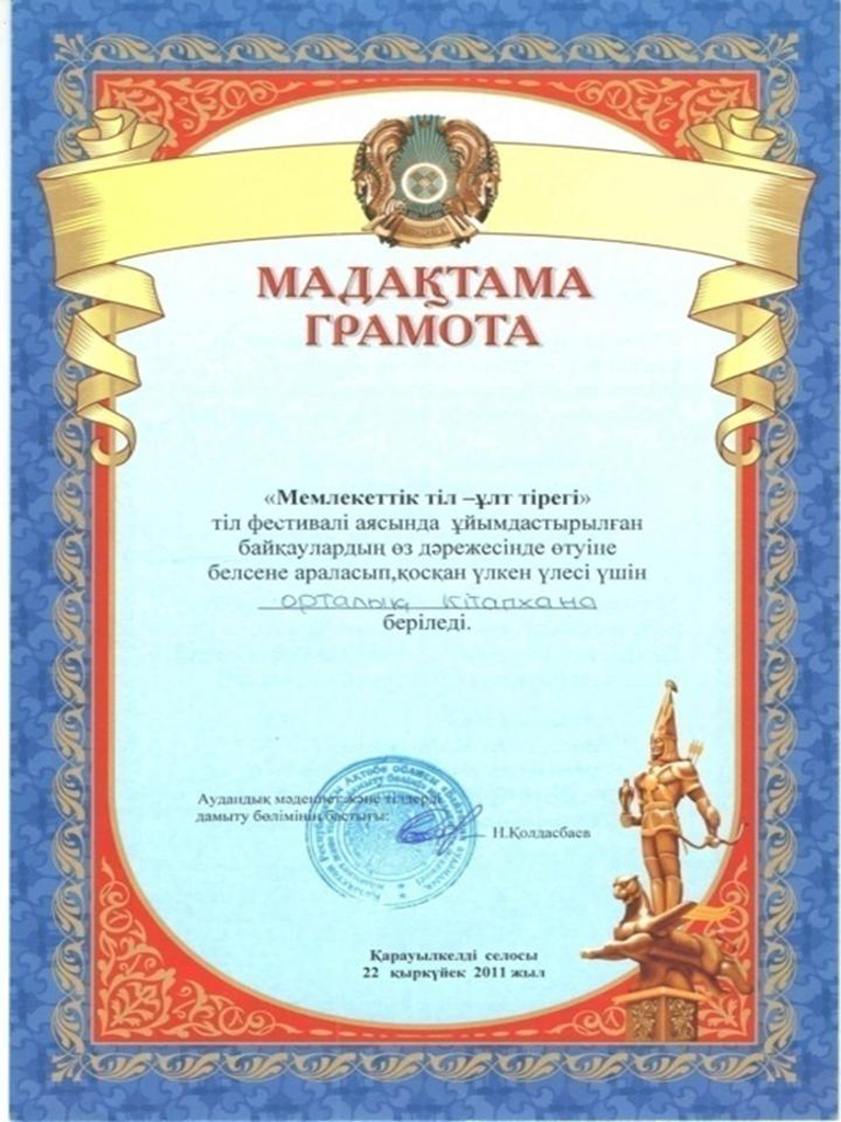 | 2011 жылы "Мемлекеттік тіл - ұлт тірегі" тіл фестивалі аясында ұйымдастырылған байқаулардың өз дәрежесінде өтуіне белсене араласып, қосқан үлкен үлесі үшін Аудандық орталық кітапхана марапатталды. |