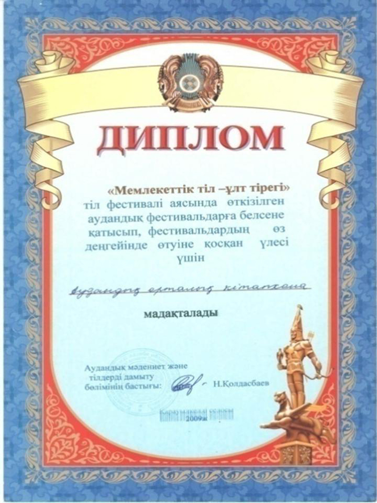 | 2009 жылы "Мемлекеттік тіл- ұлт тірегі" тіл фестивалі аясында өткізілген аудандық фестивалдарға белсене қатысып, фестивальдардың өз деңгейінде өтуіне қосқан үлесі үшін Аудандық орталық кітапхана марапатталды |