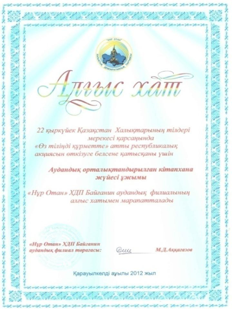 | 2012 жылы 22 қыркүйек Қазақстан Халықтарының тілдері мерекесі қарсаңында "Өз тіліңді құрметте" атты республикалық акциясын өткізуге белсене қатысқаны үшін Аудандық орталықтандырылған кітапхана жүйесі ұжымы "Нұр Отан" ХДП Байғанин аудандық филиалының Алғыс хатына ие болды. |